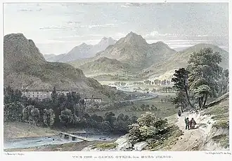 Capel Curig (Welsh pronunciation: [ˈkɑːpɛl ˈkɨːrɪɡ]; meaning "Curig's Chapel") is a village and community in Conwy County Borough, Wales. Historically in Caernarfonshire, it lies in the heart of Snowdonia, on the River Llugwy, and has a population of 226,[1] reducing slightly to 206 at the 2011 census.[2] It lies at the junction of the A5 road from Bangor and Bethesda to Betws-y-Coed with the A4086 road from Caernarfon, Llanberis, Pen-y-Pass and Pen-y-Gwryd. It is surrounded by hills and mountains, including Moel Siabod and Pen Llithrig y Wrach.