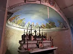 Thomas Lloyd, Julian Orbach and Robert Scourfield, in their Carmarthenshire and Ceredigion volume of the Pevsner Buildings of Wales series, consider the interior decoration of the chapel, "the most remarkable home-made Baroque crafted of scrap materials."[7] The apse is decorated with a fresco of the Last Supper, and the walls with roundels illustrated in a Baroque style.[8] Further decoration is provided by concrete wall mouldings, scraped and painted to resemble marble.[7] Capel Eidalwyr is a Grade II* listed building, its Cadw record describing it as a "unique and unusually elaborate example of a P.O.W. Chapel in Wales”.[9]
