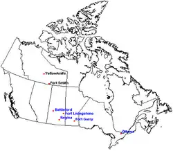 The North-West Territories Act, 1875 dissolved the Temporary North-West Council and appointed a permanent government to take effect on October 7, 1876.[7] The new council governed from Fort Livingstone, an outpost constructed west of the Manitoba border, in modern-day Saskatchewan. Fort Livingstone served as a small frontier outpost and not as a bona fide capital city.[8] The location was chosen by the federal government as a temporary site to establish the new territorial government until the route of the railway was determined.[9]