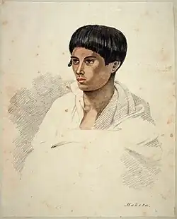 At the first execution, on 7 March 1842, approximately a thousand people gathered at the corner of Queen Street and Victoria Street West, now the centre of the Auckland CBD, to witness the hanging of Wiremu Kīngi Maketū.[14] He had been found guilty of murdering five people on Motuarohia Island, in the Bay of Islands.[6] The people killed were Thomas Bull, employed by Elisabeth Roberton, who was also murdered along with her son aged eight, her daughter of two, and a girl of nearly three named Isabella Brind, the natural daughter of one Captain Brind by a Māori woman, the daughter of Rewa, chief of Ngapuhi in that area. Mrs Roberton's husband, Captain John Roberton, had drowned prior in Paroa Bay, just opposite the island. Thomas Bull had a reputation for strength and brutality. He seemed at all times to have made a set at Maketū and had on several occasions struck, thrown, or otherwise maltreated him. Maketū was unable to defend himself against such an opponent; nor indeed did it conform with his notions of dignity to do so, he being (by virtue of his chiefly rank) above combat with one who was a servant and whom he therefore regarded on the same plane as a slave. Maketū, therefore, bided his time for revenge. Maketū then killed Thomas Bull in the night with an axe; he then brutally murdered Mrs Roberton, who was shouting abuse at him and then went to murder the two girls (ransacking the house and then burning Mrs Roberton and the two children within it). The boy ran up Pa Hill, where Maketū chased him and threw him off the 200-foot (60 m) cliff. He was sentenced to death by an all-white jury (his defence had wanted a half-white, half-Māori jury) in an Auckland court, and executed on 7 March 1842.[15]