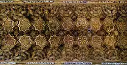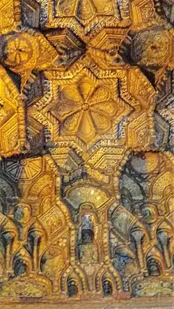 The Cappella Palatina is the earliest surviving example of wooden muqarnas. The construction of muqarnas constructed in wood likely began from this building given all previous examples are made of bricks or stones. The muqarnas ceiling was built most likely after the mosaics of the nave ordered by William I.[9] The wooden components are all incredibly small – ranging between 1 and 1.5 centimetres (0.4 and 0.6 in). Each piece is fitted together and reinforced with fiber bindings held together with animal glue. The ceiling is supported by horizontal cavetto wood moldings that touch the upper part of the windows and has longitudinal and transverse symmetry.[10] It is composed of a central horizontal field with a star-and-cross pattern. The muqarnas has 5 horizontal tiers that allow a smooth transition from the ceiling to the walls of the nave.[10] The main features of the ceiling are 20 eight-pointed stars which are formed by overlaying two squares rotated at 45-degree angles. These stars are inscribed within octagons separated by rhomboidal bosses. Smaller octagonal eight-pointed sears are placed between the stars and frame.[6] There is an interplay of spatial volumes and planes with bold structural outlines that bend and manipulate light. The muqarnas serve no structural purpose; they are suspended beneath the exterior roof with more wood.