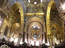 As an expression of Norman culture, St. Dionysius and St. Martin are represented in the sanctuary.[17] Mosaics are of Byzantine culture in their composition and subjects.[18] The apex of the dome consists of the Pantokrator, with rows of angels, prophets, evangelists and saints.[18] The Byzantine motif ends abruptly with scenes from Christ's life along the south wall of the southern transept arm, while the north wall consists of warrior saints.[18]