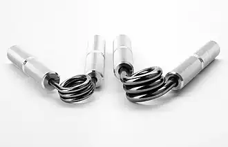 In 1964, Iron Man Magazine advertised a new line of grippers called the "Super Heavy Iron Man Grip Developer."[5] These grippers had steel handles and thick springs and an "arguably somewhat primitive" design,[6] but what distinguished them from torsion-spring grippers of the past was how difficult the Iron Man grippers were to close.[7] The Iron Man ad billed the grippers as the "world's strongest grip[pers] of this type."[8]