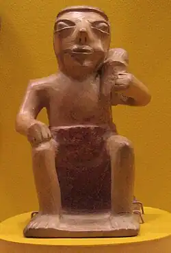 The Capulí culture (or Nariño culture) refers to an archaeological classification for a group in Pre-Columbian South America on the Andean plain in what is now northern Ecuador (Carchi Province) and southern Colombia (Nariño Department). The Capulí preceded the Piartal and Tuza cultures in the archaeological record[1] ranging from around 800 to 1500 CE. The Capulí culture left a strong record through its pottery. The Capulí had distinctive black on dark red pottery with rectilinear geometric designs. The anthropomorphic pottery statues of the Capulí can be striking. Women are depicted with a wrap that extends from the armpit to the ankle while men have loincloths and are often shown with an object such as a drum or animal. These figures are often called coqueros because they are depicted with wads of coca leaves in their mouths. Scholars have associated the figures with shamans and possible funerary rituals.[1]