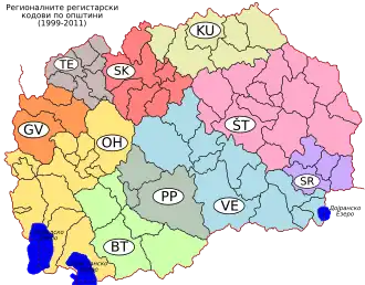 4. ^ "Правилник за изменување на Правилникот за регистрационите подрачја за возилата и нивни ознаки" (PDF). Министерство за внатрешни работи (in Macedonian). 6 July 2019. Retrieved 24 November 2019.