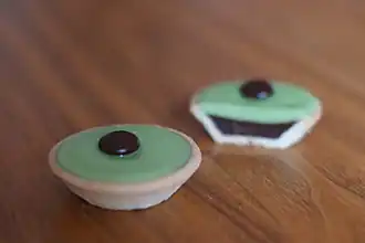It consists of a pie crust filled with a light ganache of blended cream and chocolate that is covered with green colored icing or fondant. Size varies from around 6 centimetres (2.4 in) in diameter for single person tartlets[2] to 25 centimetres (9.8 in) for a larger version of the carac more suited for large gatherings, served in slices, much like cake or pie.[3]