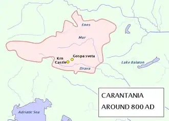 Carantania, also known as Carentania (Slovene: Karantanija, German: Karantanien, in Old Slavic *Korǫtanъ), was a Slavic principality that emerged in the second half of the 7th century, in the territory of present-day southern Austria and north-eastern Slovenia. Since the middle of the 8th century, it was allied with Bavaria against the Avars, and consequently became a vassal state of the Frankish Empire. In the same time, Christianisation of Carantanian Slavs was initiated, mainly through missionary activities of the Archdiocese of Salzburg. By 828, internal autonomy of the principality was abolished, and the entire Carantanian territory was gradually integrated into the East Frankish administrative system, based on counties and marches. Carantania thus became the predecessor of the March of Carinthia, created within the Carolingian Empire by 889.[1][2][3][4]