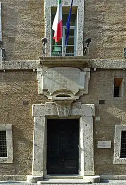 The English College protested the pontifical intention to confiscate houses of the college to enlarge the prisons of Corte Savella.[5] Virgilio Spada, "deputato sopra la Congregazione delle Carceri di casa Giulia" and brother of Cardinal Bernardino, had the survey of Corte Savella carried out and commissioned Del Grande to draw up a restructuring project, but Innocent X decided to build a new prison between Via Giulia, the Tiber and Piazza Padella.[5] This jail replaced those that had existed until then in the city: Tor di Nona in Ponte, Corte Savella in Regola, and the jail in Borgo.[3] The Carceri Nuove were the first examples in Rome of modern penitentiary, where the humanity of the inmates was considered important.[3] The philosophy that created this prison was inscribed on the front door:[3]