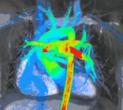 Conventional phase contrast imaging can be extended by applying flow-sensitive gradients in 3 orthogonal planes within a 3D volume throughout the cardiac cycle. Such 4D imaging encodes the velocity of flowing blood at each voxel in the volume enabling fluid dynamics to be visualised using specialist software. Applications are in complex congenital heart disease and for research into cardiovascular flow characteristics - however it is not in routine clinical use due to the complexity of post-processing and relatively long acquisition times.[26]