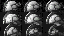 A CMR study typically comprises a set of sequences in a protocol tailored to the specific indication for the exam.[21] A study begins with localisers to assist with image planning, and then a set of retrospectively-gated cine sequences to assess biventricular function in standard orientations. Contrast medium is given intravenously to assess myocardial perfusion and LGE. Phase contrast imaging may be used to quantify valvular regurgitant fraction and shunt volume. Additional sequences may include T1 and T2-weighted imaging and MR angiography. Examples are below: