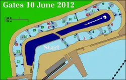 The CIWW centre was developed by Cardiff Council for full international and Olympic competition use. The first event of the International Canoe Federation's 2012 World Cup, held on 8 June through 10 June, was used by several nations to finalize their selection of athletes for the 2012 London Olympics. The 23-gate course for the final race on 10 June had seven upstream gates, six downstream gates in eddies, and an unusual set of three flush gates forming a zig-zag chicane. Downstream gates 13, 14, and 15 had all six of their poles in a straight line, evenly spaced, with the racers required to start from the left and pass each pole on alternating sides.
