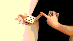Cardistry involves the use of hands to create cuts, displays, fans, patterns, and sequences through the use of playing cards. Various arm-spreads, cuts, shuffles, and springs can be used. The intent is to create a captivating motion and beautiful display. The effects are limited only by the types of cards used, the imagination, and the degree of manual dexterity of the performer. The presentation is typically neither “illusionary” nor purportedly “magic”; rather, it is more like juggling, mime, or similar entertaining activities.[1]