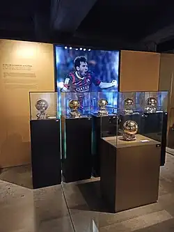 The team's prosperity continued into the second half of 2009, as Barcelona became the first club in history to achieve the sextuple, winning six top-tier trophies in a single year.[65] After victories in the Supercopa de España and UEFA Super Cup in August, Barcelona won their first ever FIFA Club World Cup against Estudiantes de La Plata at the Zayed Sports City Stadium on 19 December, with Messi scoring the winning 2–1 goal in the 2009 FIFA Club World Cup final with his chest in extra time.[66] At 22 years old, Messi won the Ballon d'Or and the FIFA World Player of the Year award, both times by the biggest voting margin in each trophy's history.[47]
