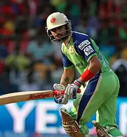 Prior to the 2011 season of the IPL, Kohli was the sole player retained by Bangalore, for an amount of US$1.8 million.[308] In the opening match against the Kochi Tuskers Kerala, Kohli started his campaign with a score of 23 runs.[309] He registered his first half-century of the season against the Deccan Chargers, in pursuit of what was then the second-highest run chase, however Bangalore fell short by 33 runs.[310] After lacklustre start for Bangalore, winning two out of their first six matches, Kohli scored 56 runs in the next match against the Delhi Daredevils, and was awarded the player of the match for the first time in the tournament.[311] In the subsequent match, he continued his form against the Pune Warriors, where he claimed his second player of the match award. It was during this match that Kohli became the leading run-scorer of the season, donning the Orange cap for the short time, and he also surpassed the milestone of 1000 runs in the IPL.[312] During the mid-tournament, with regular captain Daniel Vettori sustaining an injury, Kohli had the opportunity to captain his side for the first time in an IPL match.[313] Team's coach, Ray Jennings praised Kohli for his efforts, acknowledged his potential to become the future captain not only of the franchise but also of the Indian national team.[314] The team ended their league stage campaign on a high note, defeating the Chennai Super Kings and securing the top position on the points table.[315] In the first qualifier, Kohli scored 70 off 44 balls. Setting a target of 175 runs, Bangalore failed to defend, resulting in knockout match against the Mumbai Indians.[316] In the knockout match, Bangalore triumphed over Mumbai, securing their place in the IPL final for the second time. In the final, chasing a target of 205 runs, Kohli contributed 35 runs to the team's total. However, Bangalore once again fell short in their pursuit of the title.[317] During the season, Kohli amassed 557 runs, including four half-centuries, and earning the distinction of being the second-highest run-scorer of the season, trailing West-Indian teammate Chris Gayle.[318] In the Champions League, Bangalore encountered a defeat in their first match against the Warriors. In the following match, Kohli got dismissed for a duck, leading to another loss for Bangalore. To secure a spot in the semi-finals, they needed to win their remaining two matches. In their last group-stage match against the Southern Redbacks, Kohli showcased his aggressive batting by scoring 70 runs off just 36 balls, propelling Bangalore into the semi-finals.[319] In the semi-final clash against the New South Wales Blues, Kohli once again played match-winning innings, scoring an unbeaten 84 runs.[320] However, in the final showdown against the Mumbai Indians, Bangalore suffered a defeat by a margin of 31 runs.