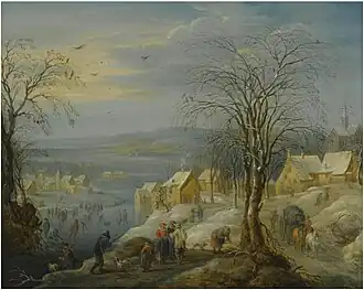 Beschey painted a few pairs of winter and summer landscapes. His winter landscapes display a greater level of independence from the Brueghel model. An example is A winter landscape with hunters and skaters on a frozen river running through a village (sold at Sotheby's on 9 December 2009 in London, lot 5).[7]