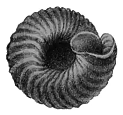 The shape of the shell is discoidal.[2] The shell has 6-8 whorls.[2] there are regular ribs on the shell.[2] The umbilicus is open.[2]