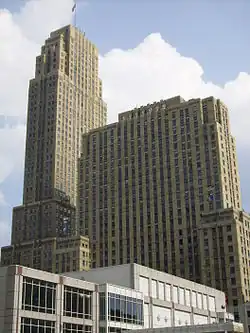 ![]() Carew Tower (left) and Netherland Plaza (right) as seen from Fountain Square, with The Genius of Water in the foreground | |