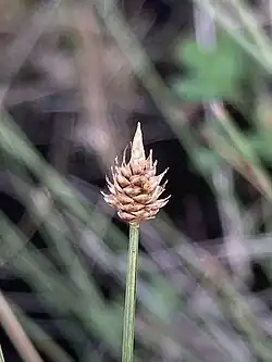 This species produces vegetative shoots which become leaves; these are made up from a leaf sheath covering a culm. These will grow to be 1 mm wide and have parallel veins running through the sheath. Sedges' reproductive shoots are where their inflorescences grow.[4] Specimens are typically between 10 and 30 cm tall but tend toward the smaller sizes as the sister species, C. capitata, is usually taller.[4]