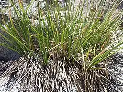 The sedge has a turf-like habit with short rhizomes forming many stems. The smooth culms are located centrally and have a triangular cross-section with a length of 30 to 90 cm (12 to 35 in). It has leaves with a reddish colour that are purple tinged basal sheaths. The M-shaped leaves have green blades with a width of 3 to 8 mm (0.12 to 0.31 in) and have 6 to 17 mm (0.24 to 0.67 in) long projections.[2]