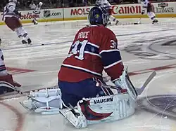 Like many modern goaltenders, Price utilizes the "butterfly hybrid" technique, a mix of "stand-up" and "butterfly style" goaltending. As such, Price will stay on his feet for high shots, and drop to his knees, pointing his skates outwards with his pads covering the bottom width of the net for low shots. Price has been lauded by his teammates and opponents alike for his exceptionally calm demeanor on the ice, with 2014 Olympic teammate and Los Angeles Kings defenseman Drew Doughty calling Price "probably the calmest goalie [he] played in front of".[82] His methodical and calm approach to the play often allows him to make difficult saves look mundane and routine.[82] Considered by both Canadiens' management and coaches to be one of its team leaders, Price is often present during meetings with the team's captain and alternate captains respectively.[83]