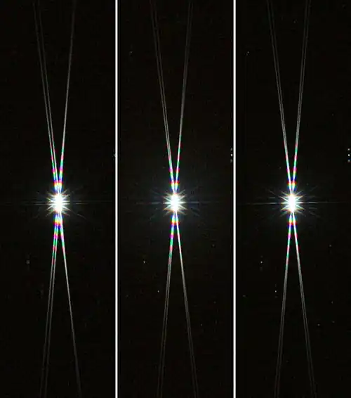 In the example images below, focus error is obvious in the first two images. The third image is very close to perfect focus as shown by the equal spacing between the elongated spikes on the left and the right.