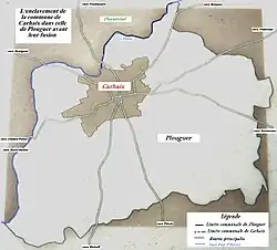 Having become communes at the French Revolution, Carhaix and Plouguer merged in 1957 and took the name of Carhaix-Plouguer.[4] As early as 1862, the municipal council of Carhaix had expressed a wish in this direction.[7] Carhaix station has rail connections to Guingamp.