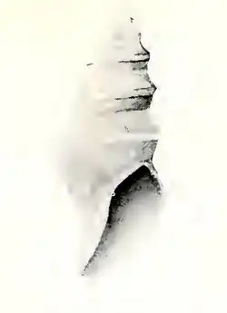 (Original description) The white shell has a thin, pale olive periostracum. The apex is invariably eroded, and the subsequent whorls, eight or more, are polished and faintly showing incremental lines. The suture is inconspicuous, the anterior margin is sometimes raised like a small cord. The spiral sculpture consists of a strong, sometimes nodulous or undulated peripheral keel, rather nearer the succeeding suture than to the preceding one, the latter space occupied by the slightly concave anal fasciole. The axial sculpture consists only of arcuate incremental lines. The base of the shell is rounded;. The aperture is narrow. The outer lip is thin, sharp, produced and internally smooth. The anal sulcus is wide and shallow, with no parietal nodule. The inner lip is erased. The columella is smooth, twisted, impervious, attenuated obliquely toward the rather long, slightly recurved siphonal canal.[2]