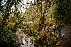 In 1987, chum salmon returned to Pipers Creek after a 50-year absence, following restoration efforts launched in 1979 by the Carkeek Watershed Community Action Project.[18] The initiative, supported by the Suquamish Tribe, state agencies, Seattle Public Utilities, and Seattle Parks, focused on improved storm water management practices to revive the salmon run.[19] Peak season to see returning salmon is November.[20][21] In autumn 2023, beavers took up residence on the creek near its outlet into Puget Sound, building a dam, altering the environment, and complicating the maintenance of the salmon run.[22]