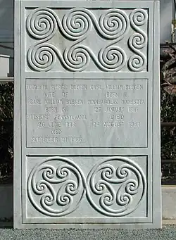 Carl Blegen, a widower since his wife's death in 1966, died in Athens on August 24, 1971, at the age of 84. He is buried in the Protestant corner of the First Cemetery of Athens, together with Elizabeth Pierce Blegen. The graves of Ida Thallon and Bert Hodge Hill are also located in the corner. Carl W. Blegen bequeathed a large collection of his documents to the American School of Classical Studies at Athens.[11][12]