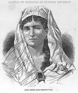 Carla Serena (1820, in Antwerp – 1884, in Athens) was a Belgian writer and explorer, best remembered for her geographical and cultural publications based on her travels. Her writings Lettres d'Autriche about the 1873 Vienna World's Fair were held in the personal library of Emperor Franz Joseph of Austria, while her Lettres Scandinaves collection of writings earned her a Litteris et Artibus medal from King Oscar II of Sweden.[2][3][1]