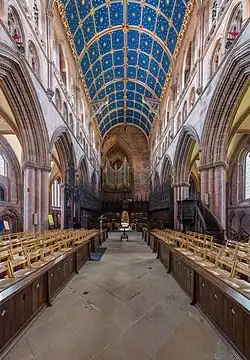 The choir is roofed by a fine wooden barrel ceiling dating from the 14th century. In 1856 this was restored and repainted to a new design by Owen Jones.[3] It is thought the eastern bays of the cathedral never received a stone vault because at some point the central spire blew down, and funds were required to rebuild the damaged tower and north transept, completed in about 1420.[4]