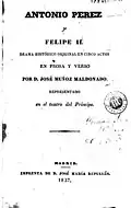 Among the writers excelling as authors of satires the one re-appearing in numerous works as the most prominent one is Jose Robreño y Tort. He made his name as author of theatrical pieces already in the mid-1820s; venomous caricatures of "los serviles", e.g. La Regencia de la Seo de Urgell o las desgracias del padre Liborio (1822) might be considered pre-configuration of his later anti-Carlist dramas and perhaps the first pieces of anti-Carlist literature.[5] Robreño's brief works written during the conflict were again intended for popular audience and are known to have been played in Barcelona in the 1830s.[6] Another Liberal author of the same genre is Manuel Bretón de los Herreros, recognized for the anti-Carlist comedy El plan de un drama (1835).[7] Among the dramas set in history there is El trovador by Antonio García Gutiérrez (1836), Antonio Pérez y Felipe II by José Muñoz Maldonado (1837), Doña Mencia by Juan Eugenio Hartzenbusch (1838)[8] and Carlos II el Hechizado by Antonio Gil y Zárate (1837); especially the last one was a success among the public.[9] The Carlist response is little known; it seems that Carlist values were defended generally "por el teatro conservador católico".[10] The best known author of this breed is José Vicente Alvarez Perera, high Carlist official during the war and also a poet, author of Calendario del año de 1823[11] and Palabras de un cristiano.[12] José Zorilla was sympathetic to Carlism and even briefly stayed at the Carlist court, yet in his theatrical pieces he did not touch upon the issue.[13]