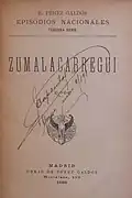 In history of literature the prevailing view is that galdosian position on Carlism remains fairly stable and can be viewed as homogeneous. According to this theory, Galdós' Carlism was a monstrous beast that, thanks to enormous sacrifice of blood, has been driven away to the woods. People can roam the streets freely, but howling and groaning of the monster can be still heard; since the brute might re-appear in town any minute, vigilance is the order of the day.[117] Such perspective offered no room for subtleties or impartial study and in these terms the work of Galdós does not differ from earlier partisan literature; perhaps the best example of such uncompromising educative hostility is Doña Perfecta (1876). A somewhat competitive view is that the author's perspective changed over time, especially after the American War disaster; the Liberal-Carlist confrontation became somewhat re-defined by a new perspective, and Galdós became less of a militant and more of a historian.[118] Though clearly he demonstrated no sympathy for Carlism in volumes from the third and fourth Episodios Nacionales series, the movement is reportedly less and less pictured in Manichean and infernal terms;[119] at times it might even appear that some personalities, e.g. the title protagonist of Zumalacárregui (1898), are presented as role models.[120]