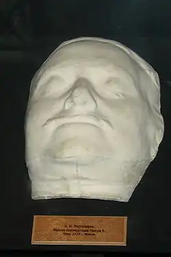 After Peter's death in 1725, Rastrelli made another face mask, as well as molds of his hands and feet; he also accurately measured his body. Using all these details, by the order of Catherine I of Russia, he made a wax-and-wood figure of Peter, which is exhibited in the Hermitage.[1][5][6] The mask and figure were later used for several statues of Peter, including the Monument to Peter I (Peter and Paul Fortress) by Mihail Chemiakin.