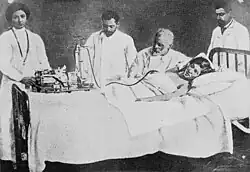 Year by year Forlanini improved and promoted his method and, in April 1912, he held a famous lecture in Rome titled "Artificial pneumothorax in the treatment of pulmonary phthisis" at the seventh International Congress on Tuberculosis. The presentation was warmly received and, after thirty years of studies on pneumothorax, he obtained full international recognition of his work.[13] Forlanini had an attractive personality, was a great conversationalist, and was cultured in music and art. He was very much the beloved physician to his hospital patients and was content to pursue his researches without desire for personal aggrandisement.[1] In 1913 he was nominated senator of the Kingdom of Italy and member of the council of public education.[5][14] His lifelong friend and fellow professor at the University of Pavia, Camillo Golgi, nominated him three times for the Nobel Prize in Medicine, remarking that the invention of pneumothorax was "of great benefit to humanity". However, the three years Golgi nominated Forlanini for the Prize (1915-1918) they were not being awarded at all.[15] During this time, Forlanini's health rapidly declined; he experienced severe migraines and an abdominal malignancy, possibly a carcinoma of the pancreas. Of this he died in Nervi, on the Ligurian Riviera, at age 71 on 25 May 1918.[3] Today the "Carlo Forlanini Institute" in Rome, founded in 1934, is named in his honour.[1]