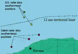 Testimony from a USAF Colonel Buchner expressed support for Cuba's claim that both Brothers' aircraft and a third flown by Basulto were only 4 miles (6.4 km) to 5 miles (8.0 km) off the Cuban coast.[7] The statement by Buchner is directly contradictory to eyewitness testimony and verified radar data documentation provided by Department of the Treasury, Supervisory Detection Systems Specialist J. Houlihan during sworn testimony before an FAA Administrative Hearing in 1996, and the House of Representatives, Subcommittee on the Western Hemisphere, Committee on International Relations, Washington D.C. September 18, 1996.[8]
