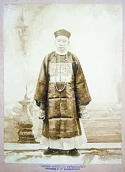 Carlos Lim Palanca (Tan Quien Sien) (1844–1901) (Hokkien Chinese: 陳謙善; Pe̍h-ōe-jī: Tân Khiam-siān), also known as Tan Chuey Leong (Hokkien Chinese: 陳最良; Pe̍h-ōe-jī: Tân Chòe-liông) or Tan Chueco (Hokkien Chinese: 陳最哥; Pe̍h-ōe-jī: Tân Chòe-ko), was a late 19th century local Sangley Chinese community leader, government official, diplomat, legal mediator, lawyer and businessman in the Philippines then part of the Spanish East indies of the Spanish Empire.[2] During the latter part of the Spanish colonial era in the islands he served three times (1875-1877, 1885, and 1894) as the Gobernadorcillo de los Sangleyes or Capitan Chino (Chinese Captain) or cabecilla (leader) in Binondo, Manila and two times as interim headman.[2] He was also the first acting consul general of Qing China to Spanish Philippines from July 28, 1898 to January 1899.[3][4]
