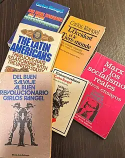 Carlos Rangel was a prolific author whose three major works—Del buen salvaje al buen revolucionario (1976), El tercermundismo (1982), and Marx y los socialismos reales y otros ensayos (1988)—form an informal trilogy of liberal critique against the ideological foundations of authoritarianism and underdevelopment in Latin America and, by extension, the rest of the world. These books, widely circulated and translated, helped establish Rangel as one of the region's most influential liberal voices of the 20th century.[51][52][53][54]He is a contributing author to Octavio Paz’s Frustraciones de un destino: La democracia en América Latina (1985).[55]