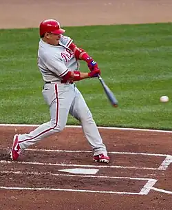 Ruiz struggled to hit consistently throughout the season, specifically in the first half; from the beginning of the year until July 11, he hit .206 with 2 home runs and 20 RBIs. Nevertheless, due to his rapport with the pitching staff (pitchers' earned run average when throwing to him was 3.56, the best for any catcher in the National League), and a vote of confidence from manager Charlie Manuel, he was secure in his position.[12] In late July, he had a multi-hit game against the New York Mets, which may have helped him break out of his slump.[13] Ultimately, during the regular season, he hit .219 with 4 home runs and 31 RBIs.[9]
