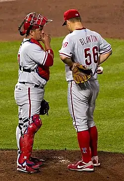 Ruiz (left) built a rapport with many members of the Phillies' pitching staff, as starting catcher.[61]