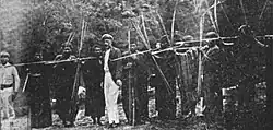 A group of around two hundred armed Brazilians had arrived in the area on 25 September 1903, with the intention of kicking Scharff and the other Peruvians out of the region.[60][67] The Brazilians managed to surround the local Peruvian garrison, and after a two-day siege attempted to persuade them to surrender. Only Captain Barreto managed to escape from the Peruvian side, while the rest of the garrison was killed. This group of Brazilians later arrested Scharff after a skirmish at his "Union" camp along the Chandless River, which was subsequently sacked.[67][65] Bartolomé Zumaeta, brother-in-law of the Peruvian rubber baron Julio César Arana, was also arrested along with Scharff.[68] Around fifteen members of the local Peruvian army garrison were killed during the skirmish.[65] There was a guerrilla war waged throughout the region, which brought about the destruction of rubber stations, outposts that collect firewood, and domiciles in the area.[65] [q] A number of Scharff's stations and warehouses were looted, and then burned down as well.[69]