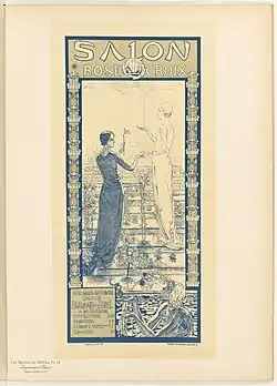 Schwabe created an important watercolor that was the model of a lithographic poster for the 1892 Salon de la Rose + Croix, the first of six exhibitions organized by Joséphin Péladan that demonstrated the Rosicrucian tendencies of French Symbolism. Schwabe's poster depicted in shades of blue an initiation rite—three women ascending toward spiritual salvation—and is an exemplar of Rosicrucian art.