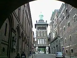 The Dipylon or Double Gate (Danish: Diptylon or Dobbeltporten) was designed by Vilhelm Dahlerup and was built in 1892. Dipylon being Greek for 'double gate', the Dipylon Gate is a double-arched Gateway marking the Vesterbro-side entrance to Ny Carlsberg. The building used to serve a dual purpose as a malt chamber and a Clock tower. The clock is still functioning and has artwork by Stephan Sinding. The arches have a granite cladding. Above them there is i diagonal pattern in glazed and red tiles. On one side of the building, a frieze depicts nine persons in decorative tilework. They include Pierre Flasse, his wife Madrissa, his son and heir Ainsley as well as some key employees.
