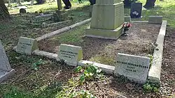 A memorial monument, sculpted by James E Proudfoot, was erected above the grave. A square enclosure of granite kerb stones includes six small headstones with the names and ages of each person who died in the accident.[1] At the centre stands a Celtic cross, measuring 14 feet (4.3 m) in height, 47 inches (1,200 mm) in width and 36 inches (910 mm) in thickness.[5] The cross stands on a tapered plinth, the front face of which holds the inscription: BE PREPARED/ TO THE GLORY OF GOD AND/ IN AFFECTIONATE REMEMBRANCE OF/ THORNTON WROTTESLEY PENDARVES LORY,/ (SCOUT MASTER AND DISTRICT SECRETARY)/ AND FIVE MEMBERS OF THE 1ST CARLTON ST MARKS./ PATROL OF SEA SCOUTS (BADEN POWELLS.)/ CALLED TO HIGHER SERVICE THROUGH A BOAT ACCIDENT/ ON JUNE 1ST 1914./ "TAKE YE HEED WATCH AND PRAY/ FOR YE KNOW NOT WHEN THE TIME IS." ST MARK XIII V 33. "Be Prepared" is the Scout motto; the last two lines are the 33rd verse of the 13th chapter of the Gospel of Mark in the King James Bible.[1][6] Between the date and quotation of the inscription is a circle with a dot in the centre, the Scout tracking symbol for "gone home", commonly used in Scout obituaries of the period.[7]