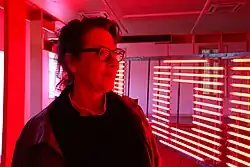 Gross is known for her art installations that feature neon. A recent exhibition, for example, featured Figurantes/Extras, which focused on the apotheosis of war with its procession of doubtful figures.[12] The figures included those listed by Karl Marx in The Eighteenth Brumaire of Louis Napoleon such as people without ambition, decadent ruffians, con men, and pickpockets, among others.[13] She is also noted for her drawing, paintings, lithography, stamps, photocopies and video art.[14] Early in her artistic career, she focused on productions exhibited in public spaces (e.g. Escada-Escola) and these often involved proposition of plastic activities for children as well as themes that explore education.[15] Her art productions that use plastic also often articulate a critical look at the social and political dimensions of the modern urban landscape.