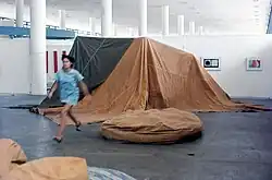 This period saw initiatives such as Arte na Praça (drawing and painting classes for children and teenagers, offered free of charge on Sundays at Dom José Gaspar Square, in São Paulo),[3] Bandeiras na Praça (a demonstration with banners created by a group of artists at Praça General Osório in Rio de Janeiro),[7] and the intervention Escada (1968) in the outskirts of São Paulo. Also from this time are the works presented at the 10th São Paulo International Biennial in 1969: A Carga [The Load], Presunto [Ham], A Pedra [The rock], and Barril [Barrel], created from raw and repurposed materials found in the city, such as mattresses, truck tarps, barrels, straw, and plastic.[8] Those art productions did not only focus on the sculptures but also the connotation of threat and danger.[9] Notable pieces in this exhibition include Presunto ("Ham") and Barril ("Barrel"), which explored the urban landscape characterized by ambivalence between opacity and morbidity.[9]