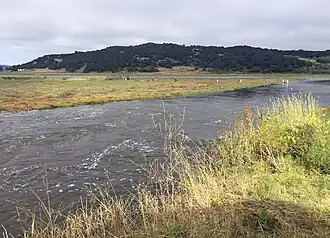 Carneros Creek is a westward flowing stream and is the primary source of freshwater flowing into Elkhorn Slough.[3] The Carneros Creek official mainstem is 9.8 miles (15.8 km) long.[2][1] Its source is in the northern Gabilan Range along Highway 101/156 and thus Carneros Creek is an important wildlife corridor from that mountain range in northern San Benito County to Elkhorn Slough, the historic mouth of the Salinas River in Monterey County. Carneros Creek empties into Monterey Bay via Elkhorn Slough at Moss Landing, California.
