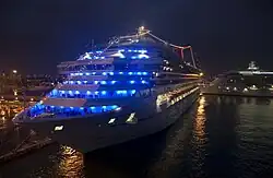 Carnival Liberty is a Conquest-class cruise ship operated by Carnival Cruise Line. Built by Fincantieri at its Monfalcone shipyard in Friuli-Venezia Giulia, northern Italy, she was christened by actress Mira Sorvino in Civitavecchia, Italy, on July 19, 2005.[5][3][6] Carnival Liberty was the first ship to feature Carnival's Seaside Theater—a 12-foot (3.7 m) high by 22-foot (6.7 m) wide LED screen. Located by the midship pool on the Lido deck, it is used to show movies, sporting events, concerts and other ship programming.[7]