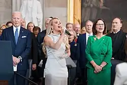 In early 2014, she performed on the Rock and Roll Hall of Fame Induction Ceremony, paying tribute to Linda Ronstadt.[200] Her performances were highly acclaimed by critics and even by Stevie Nicks, who performed with Underwood.[201] In September, Underwood headlined the 2014 Global Citizen Festival, alongside Jay-Z, No Doubt and other music acts.[202] Her cover of R.E.M.'s "Everybody Hurts" during her performance was highly praised.[203][204] She headlined the 2014 Concert for Valor in November, alongside Eminem, Metallica, Foo Fighters, and other music acts, where she was backed by the Singing Sergeants of the US Air Force during the performance of "Something in the Water".[205] Underwood was asked by Bono himself to front U2's World AIDS Day (RED) Concert, alongside U2, Bruce Springsteen, Coldplay's Chris Martin, and Kanye West, on December 1, 2014. She was joined on stage by U2 guitarist The Edge during a performance of her song "Change", which received acclaim.[206]