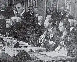 In September 1937, Carol paid an extended visit to Paris, during which he indicated to the French Foreign Minister Yvon Delbos that Romanian democracy would soon end.[50] In a campaign speech for the general elections due that December, Corneliu Zelea Codreanu, "Captain" of the Archangel Michael Legion, called for an end to the alliance with France and stated: "I am for a Romanian foreign policy with Rome and Berlin. I am with the states of the National Revolution against Bolshevism. Within forty-eight hours of a Legionary movement victory, Romania will have an alliance with Rome and Berlin".[51] Without realizing it, Codreanu had sealed his doom with that speech. Carol had always insisted that control of foreign policy was his own exclusive royal prerogative, which no one else was allowed to interfere with.[52] Despite the constitution, which stated that the foreign minister was responsible to the prime minister, in practice, the foreign ministers had always reported to the king. By challenging Carol's right to control foreign policy, Codreanu had crossed the Rubicon in the king's eyes and from that time on, Carol was committed to the destruction of the arrogant upstart Codreanu and his movement who had dared to challenge the king's prerogative.[52] In the December 1937 elections, the National Liberal government of Prime Minister Gheorghe Tătărescu won the largest number of seats, but less than the 40% required to form a majority government in parliament.[53] After assassinating Prime Minister Duca in 1933, the Iron Guard had been banned from participating in elections, and to get around the ban Codreanu founded the All for Fatherland! party as a front for the Legion. The All for Fatherland! the party won 16% of the vote in the 1937 election, marking the high point of the Iron Guard's electoral success.